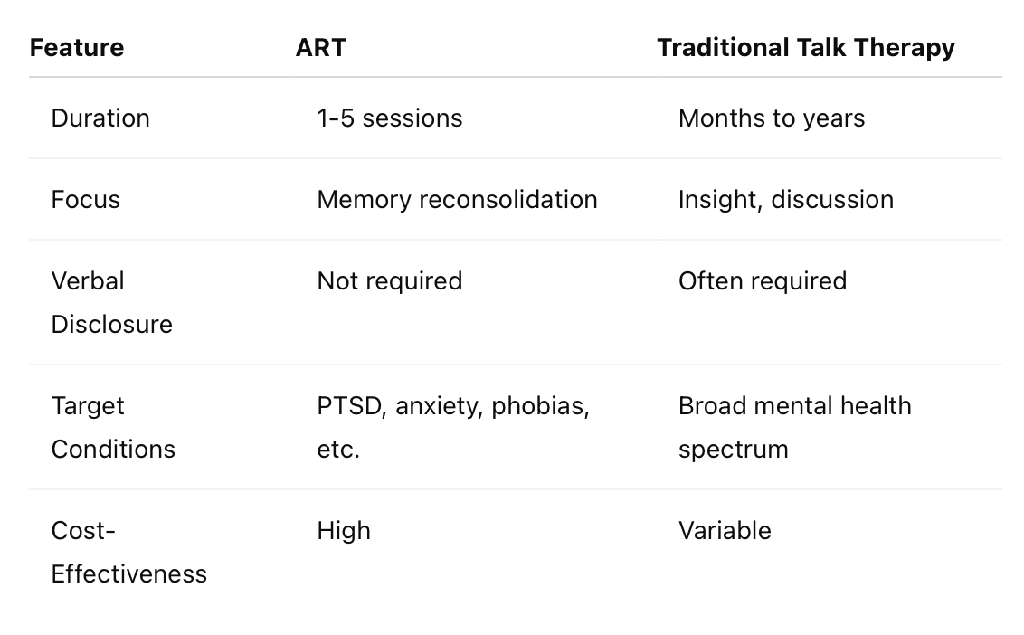Unlike traditional psychotherapy, which often involves years of discussion and emotional processing, ART is designed for speed and efficiency. Here’s how they compare: